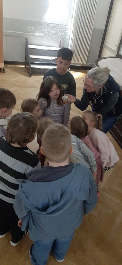 So besuchten bspw. die Kinder der 2b die Dokumentation Spurensuche in den Flussauen. Gemeinsam mit der Moderatorin Pia gingen die Kinder auf die Suche nach Schildkröten, Bibern und wildlebenden Pferden in der Donauaue. Da Perleberg nicht weit von der Elbe liegt, lud dieser Film zur Reflexion der Elbaue ein, die die Kinder in ihrer Freizeit häufig besuchen. Einige Informationen waren den Kindern daher nicht neu und so konnten sie in der anschließenden Nachbereitung viel von ihrem eigenen Wissen in das Gespräch einbringen. Der mitgebrachte Biberschädel und das Biberfell, welches die Kinder sogar anfassen durften, rundeten die Veranstaltung erfolgreich ab.