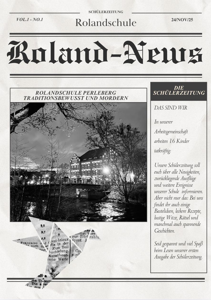 Am 24. November 2025 erschien unsere erste Ausgabe der „Roland-News“. Jede Klasse erhielt ein Exemplar und jeder konnte für 0,50€ eine eigene Zeitung erwerben. Wir freuen uns schon sehr auf die nächsten Ausgaben, die natürlich wieder voller Überraschungen steckt. Bleibt gespannt – unsere 16 Reporter haben noch viele Ideen!